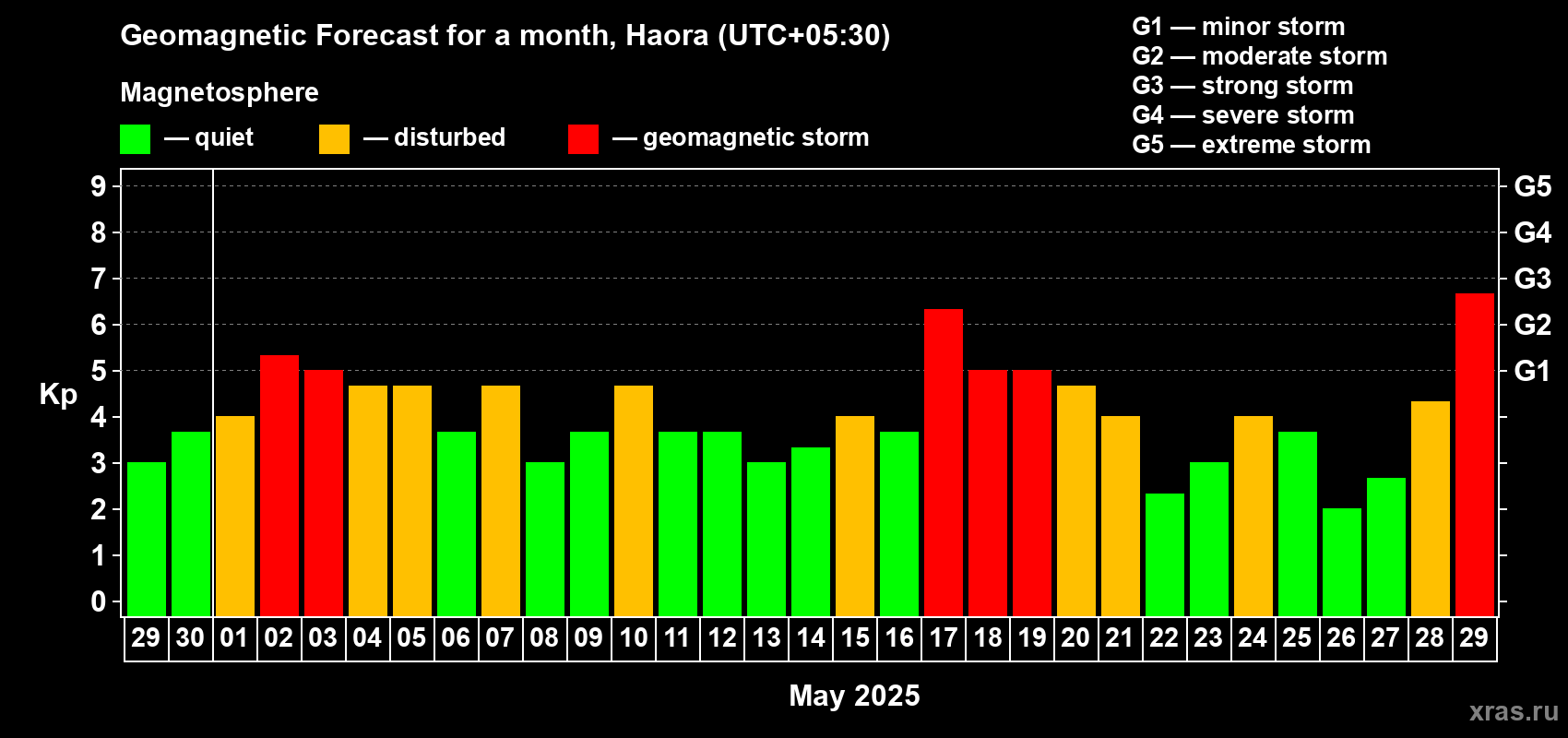 Geomagnetic storm forecast in Haora for Apr 29, 2025