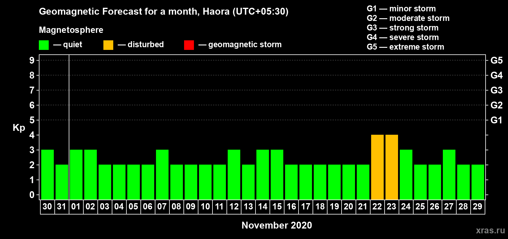Geomagnetic storm forecast in Haora for Oct 30, 2020