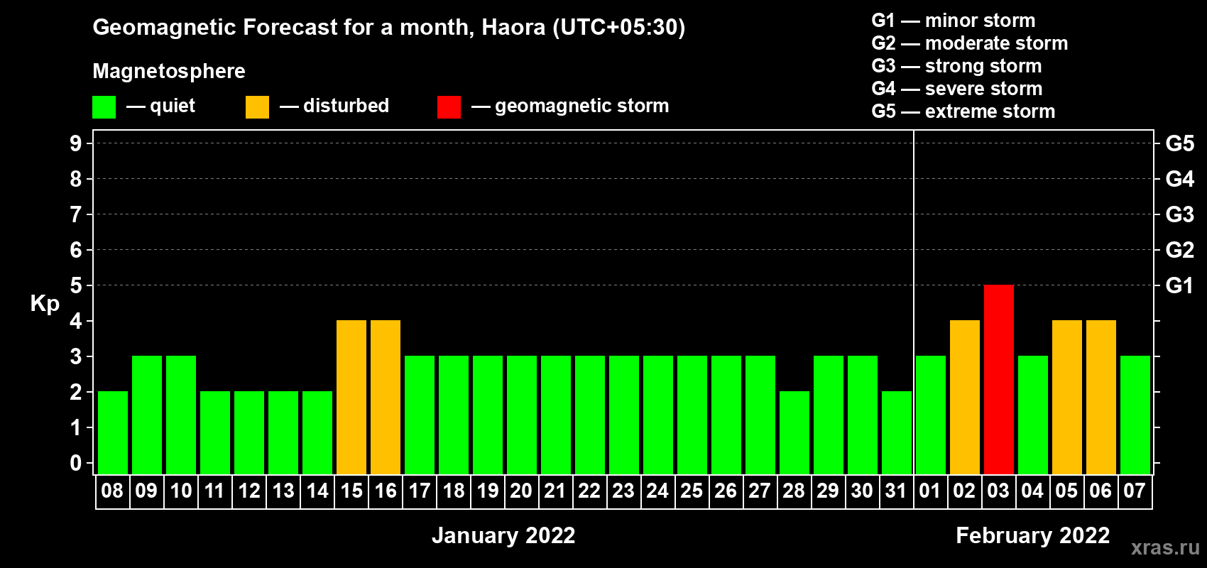 Geomagnetic storm forecast in Haora for Jan 08, 2022