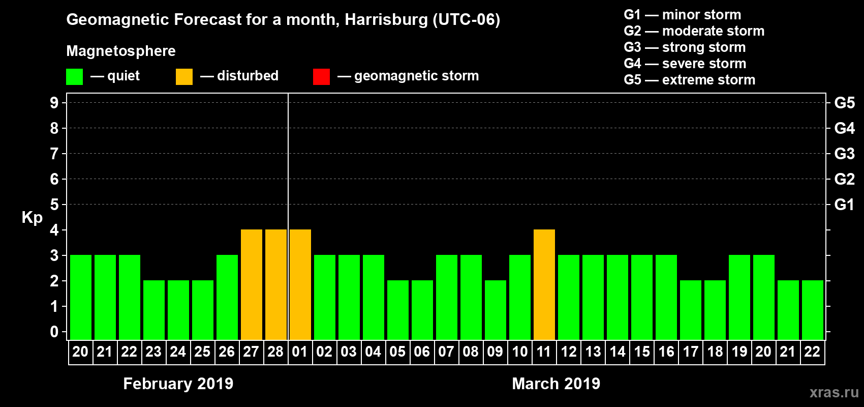 Geomagnetic storm forecast in Harrisburg for Feb 20, 2019