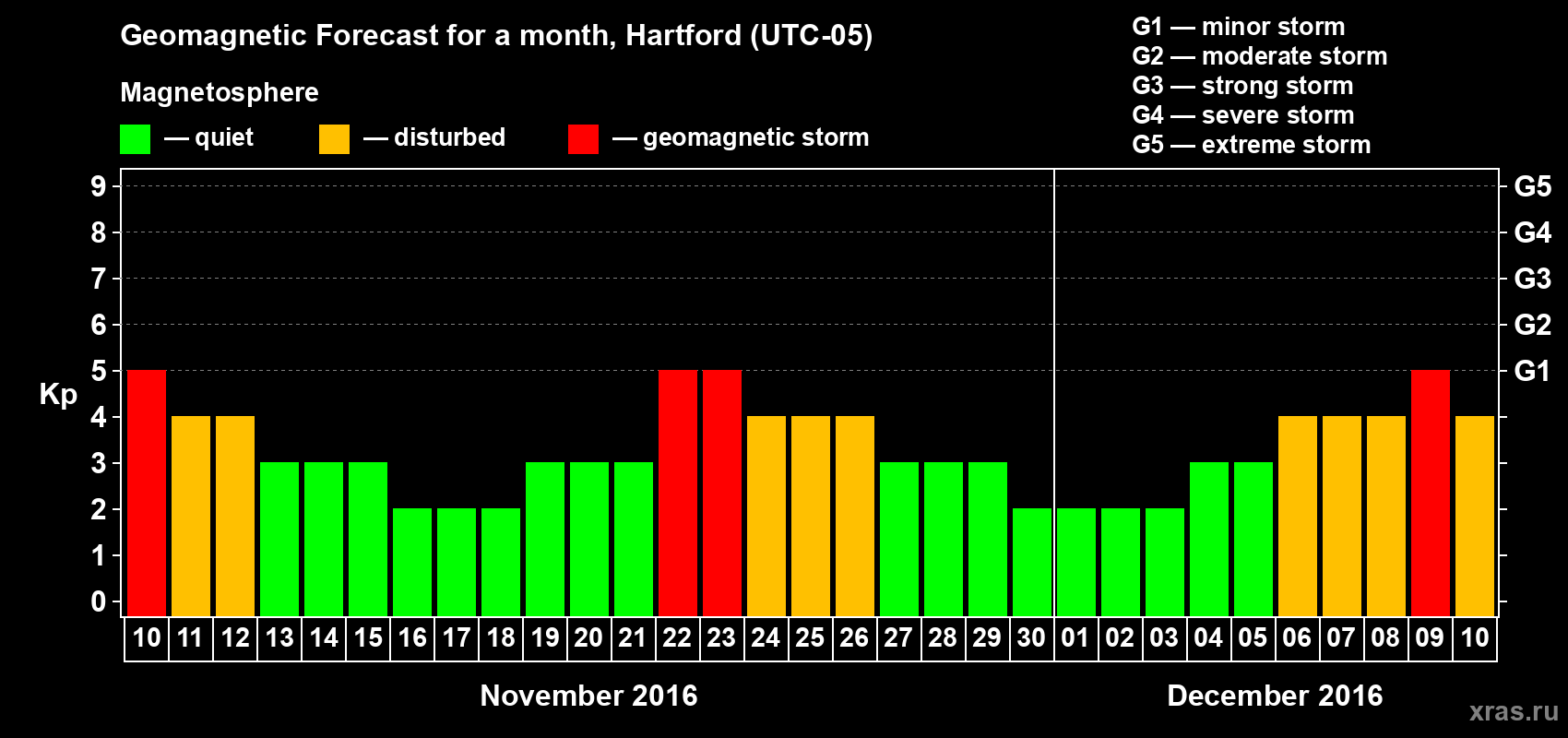 Geomagnetic storm forecast in Hartford for Nov 10, 2016