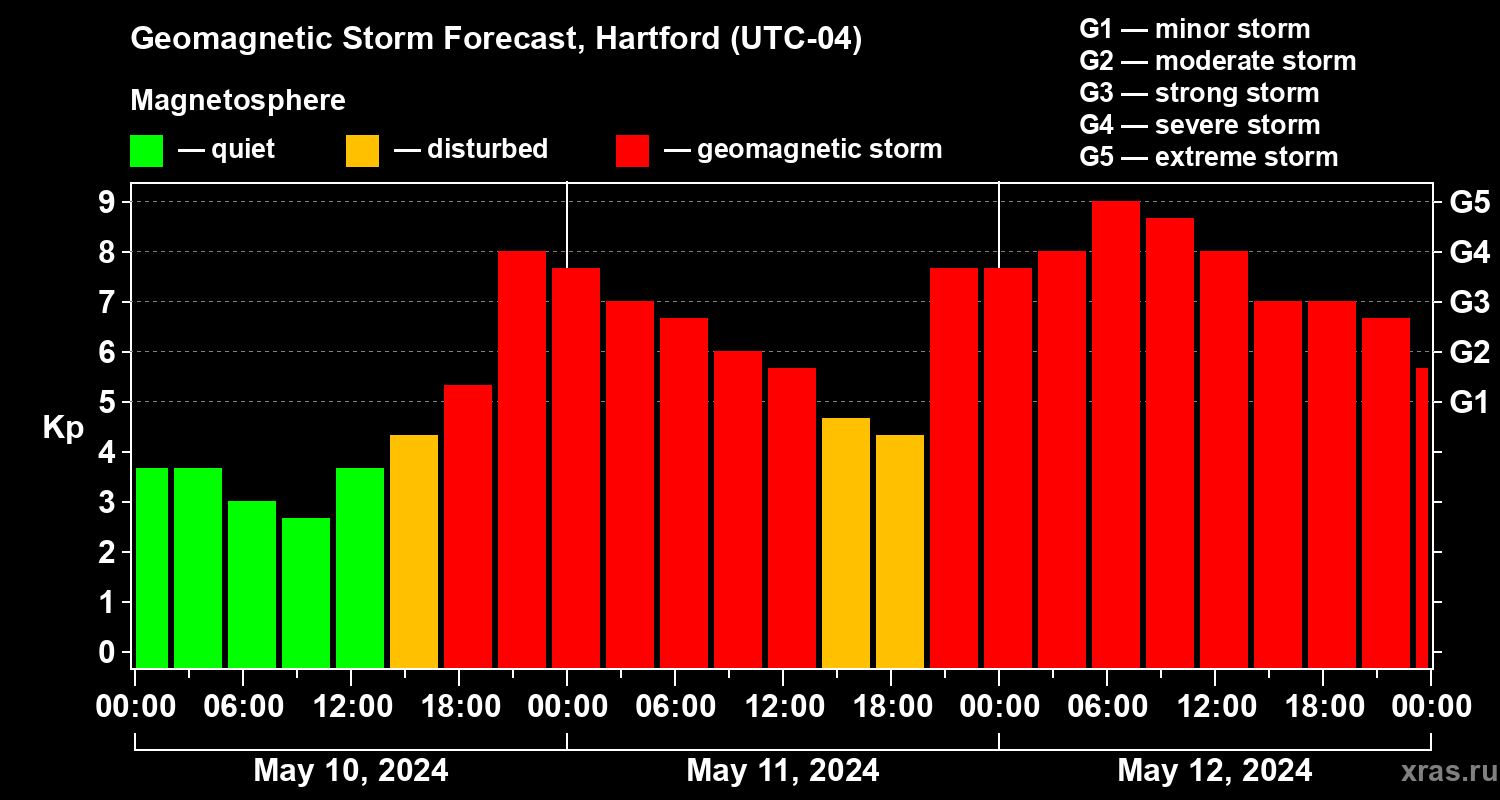 Geomagnetic storm forecast in Hartford for May 10, 2024