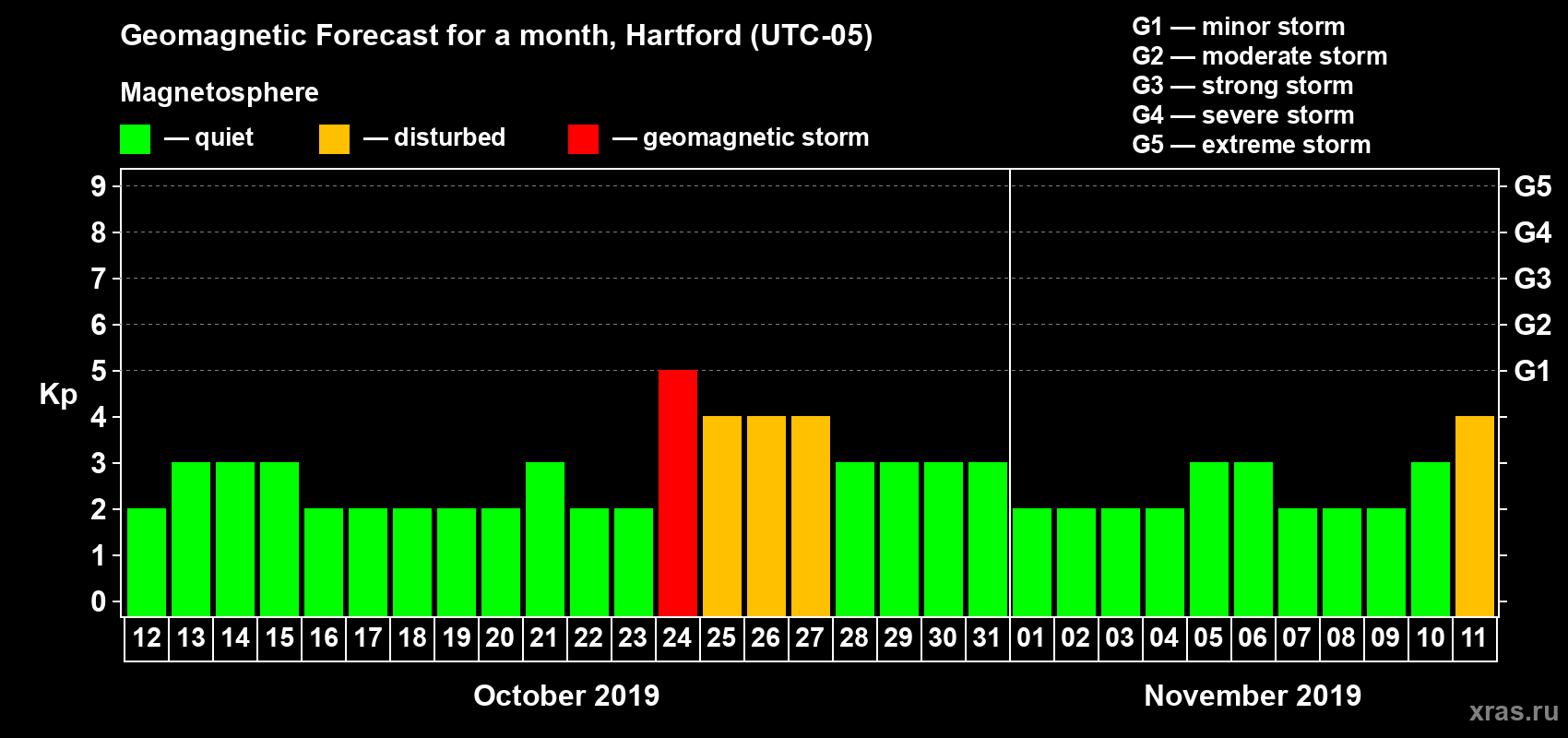 Geomagnetic storm forecast in Hartford for Oct 12, 2019