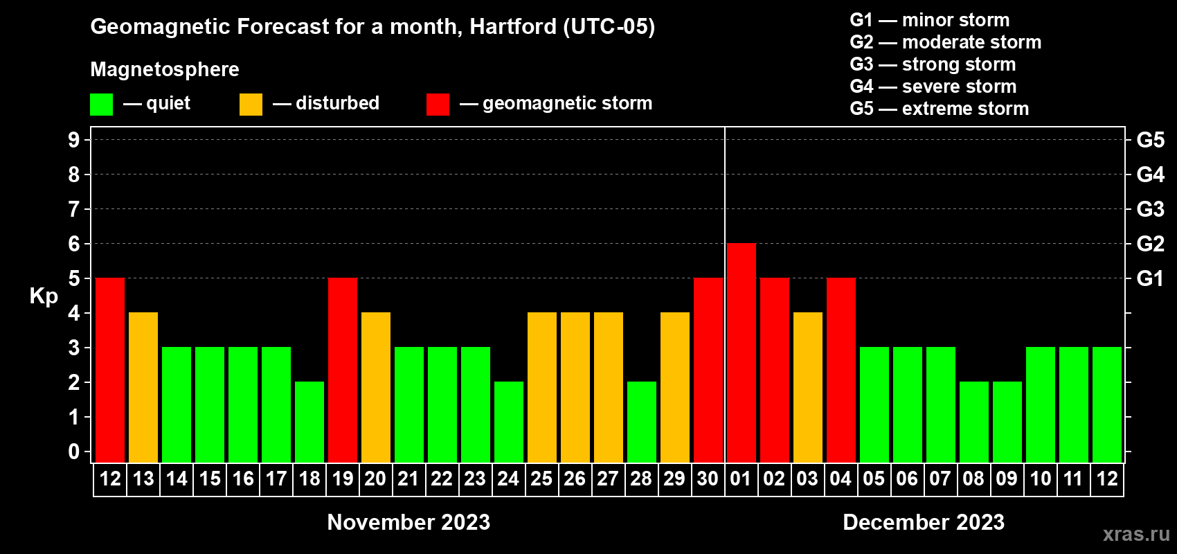 Geomagnetic storm forecast in Hartford for Nov 12, 2023