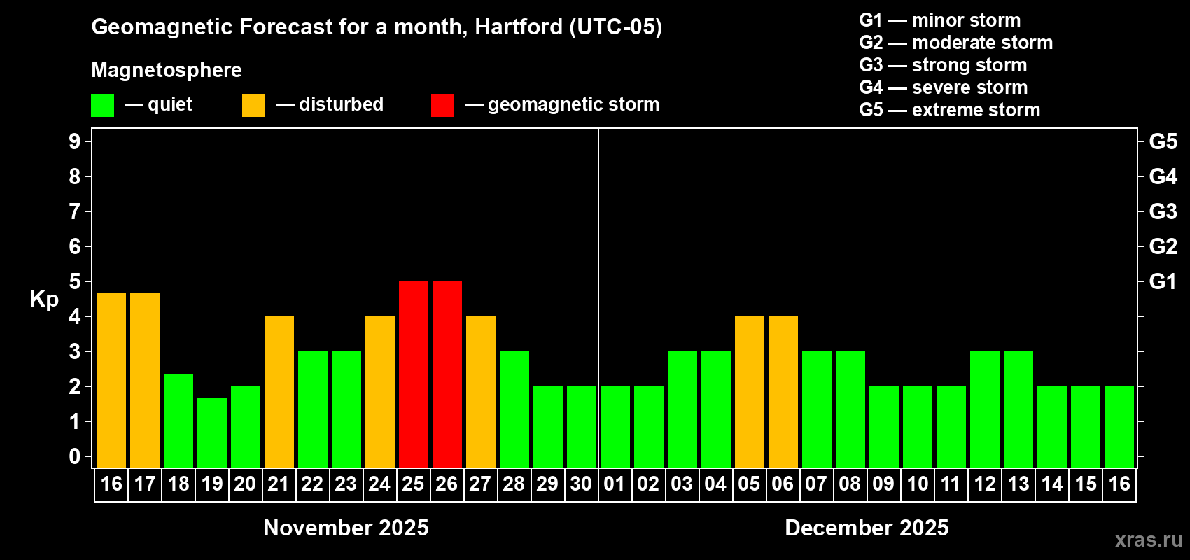 Geomagnetic storm forecast in Hartford for Nov 16, 2025