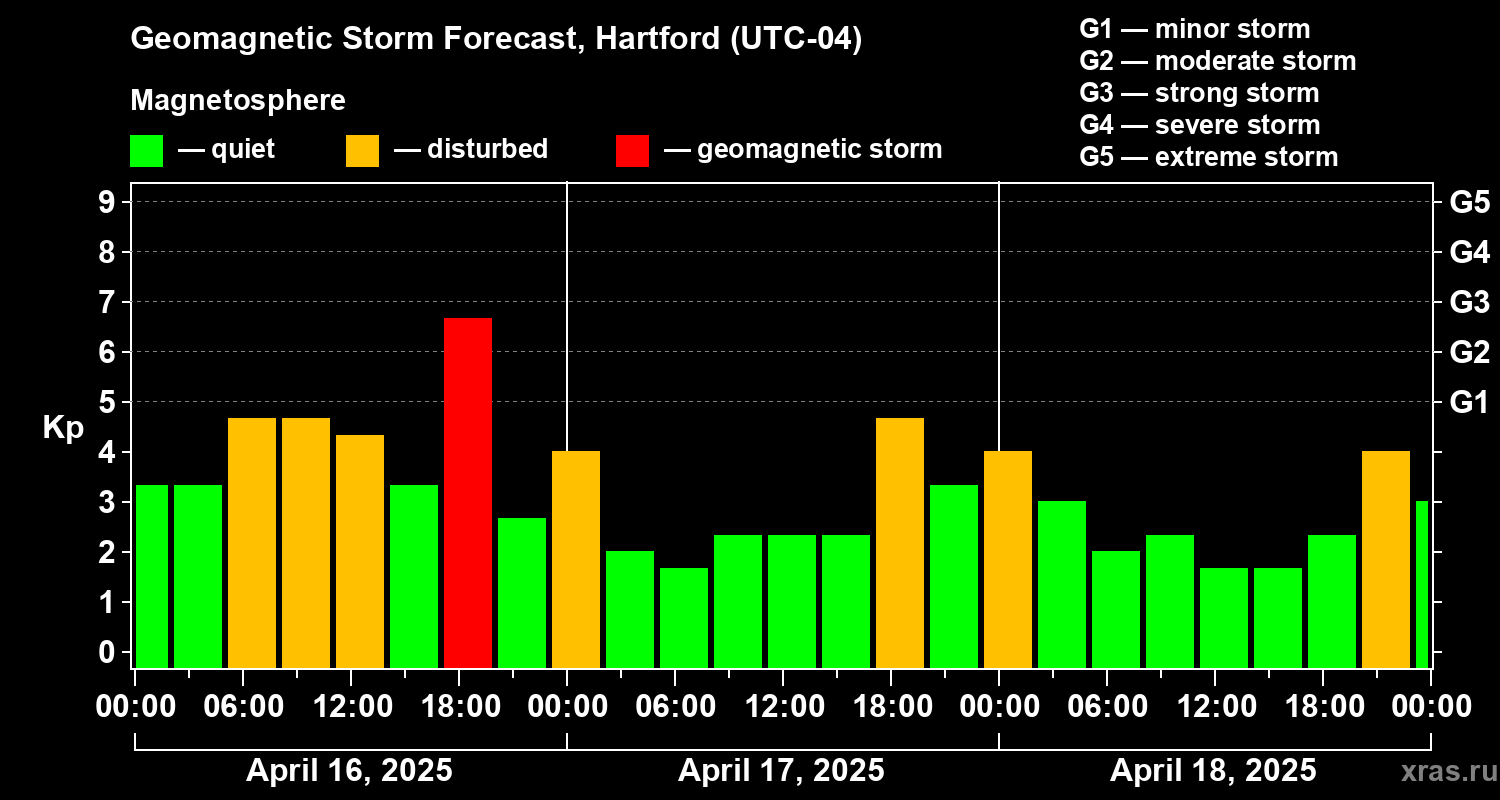 Geomagnetic storm forecast in Hartford for Apr 16, 2025