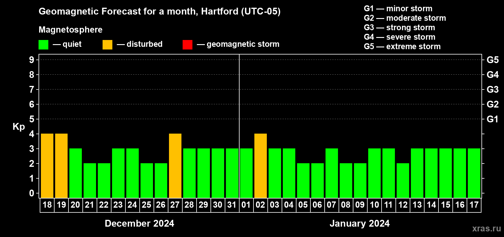 Geomagnetic storm forecast in Hartford for Dec 18, 2023
