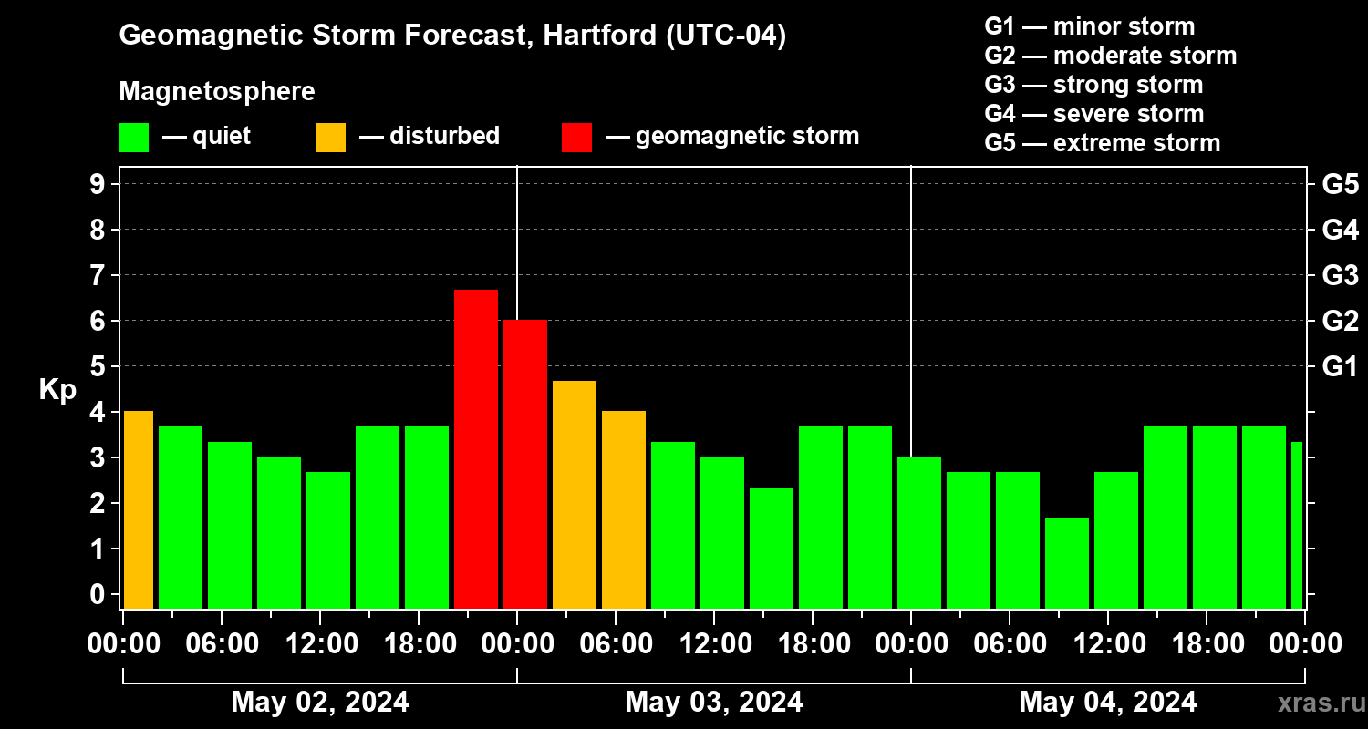 Geomagnetic storm forecast in Hartford for May 02, 2024