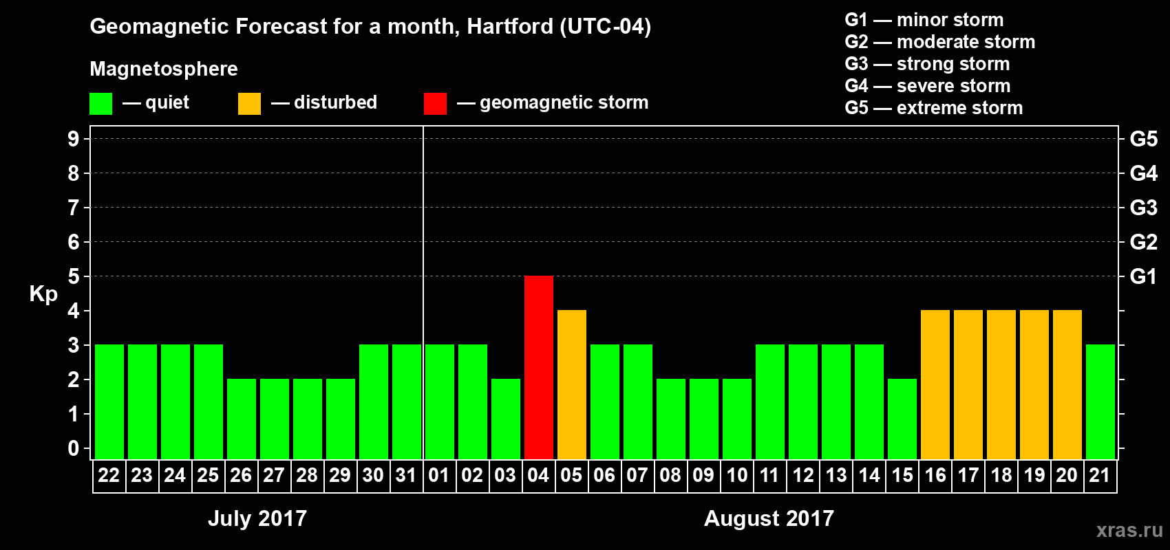 Geomagnetic storm forecast in Hartford for Jul 22, 2017