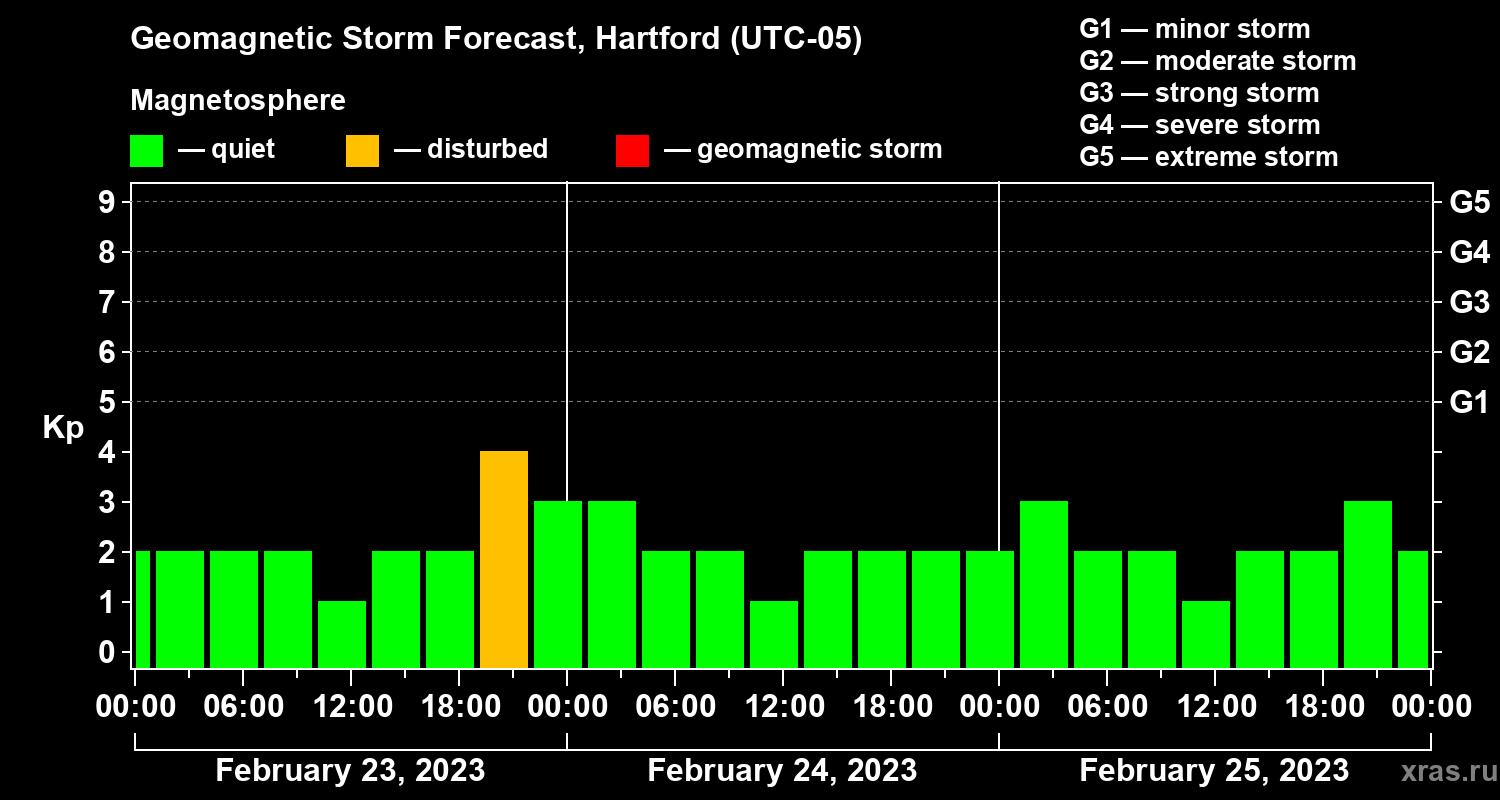 Geomagnetic storm forecast in Hartford for Feb 23, 2023