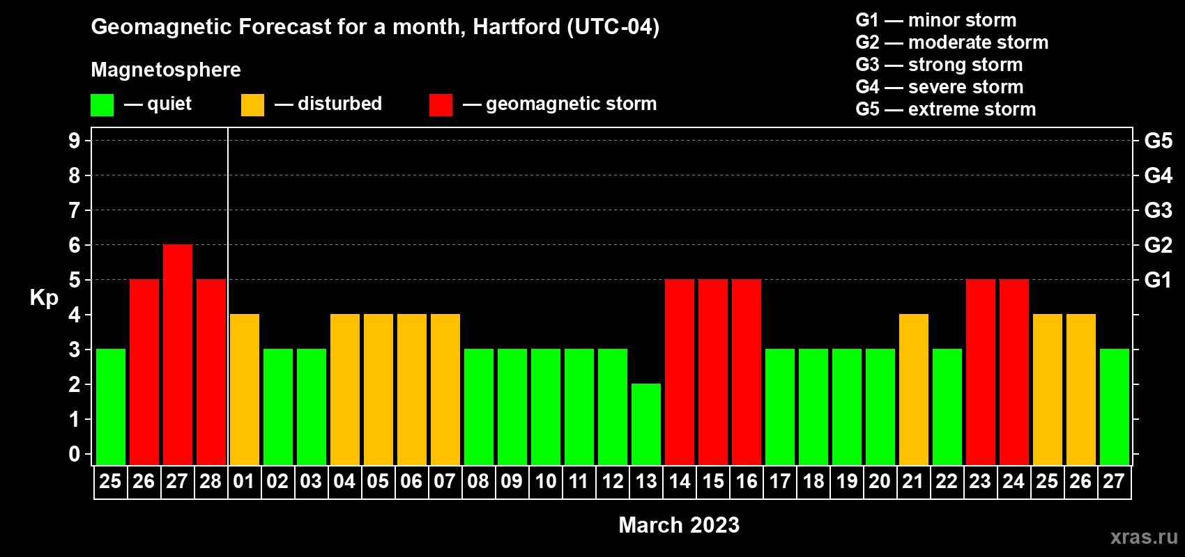 Geomagnetic storm forecast in Hartford for Feb 25, 2023