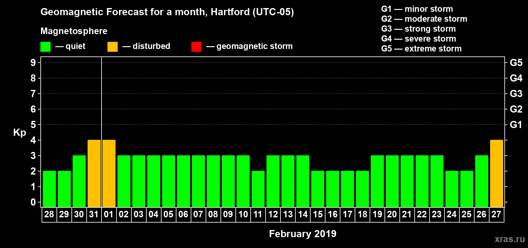 Geomagnetic storm forecast in Hartford for Jan 28, 2019