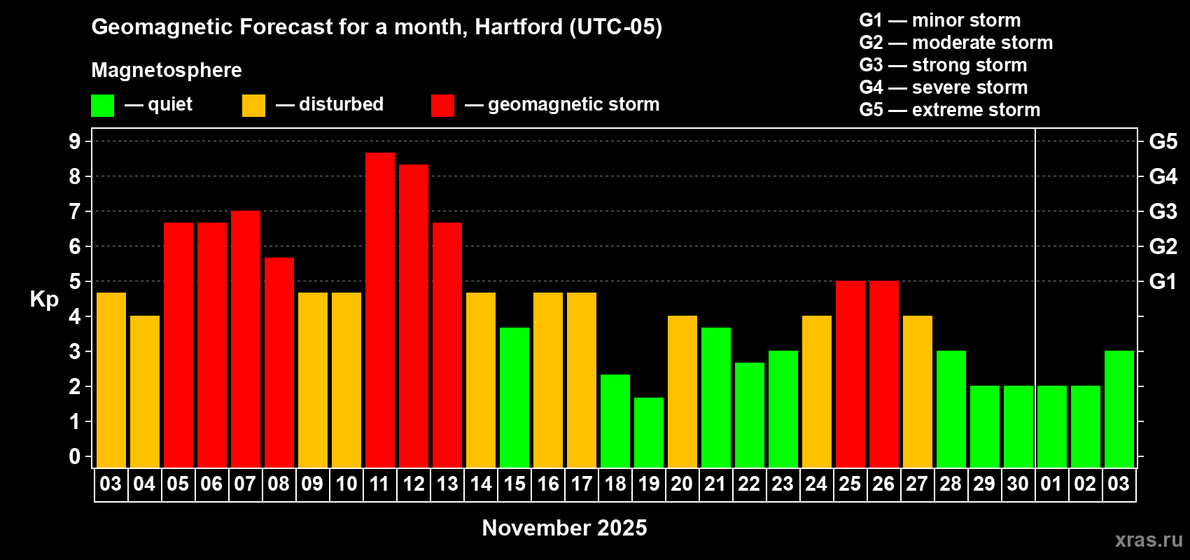 Geomagnetic storm forecast in Hartford for Nov 03, 2025