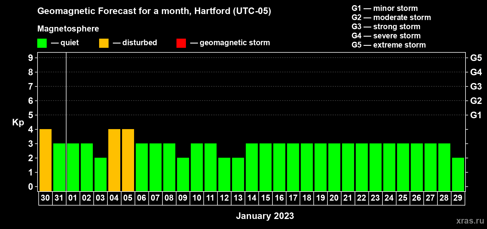 Geomagnetic storm forecast in Hartford for Dec 30, 2022
