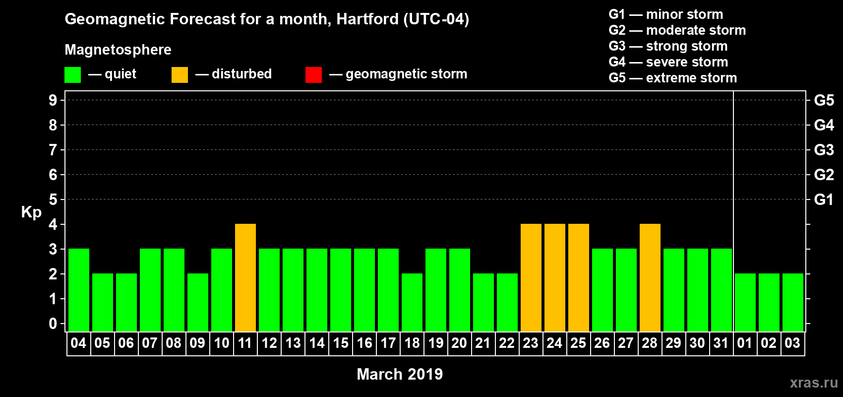 Geomagnetic storm forecast in Hartford for Mar 04, 2019