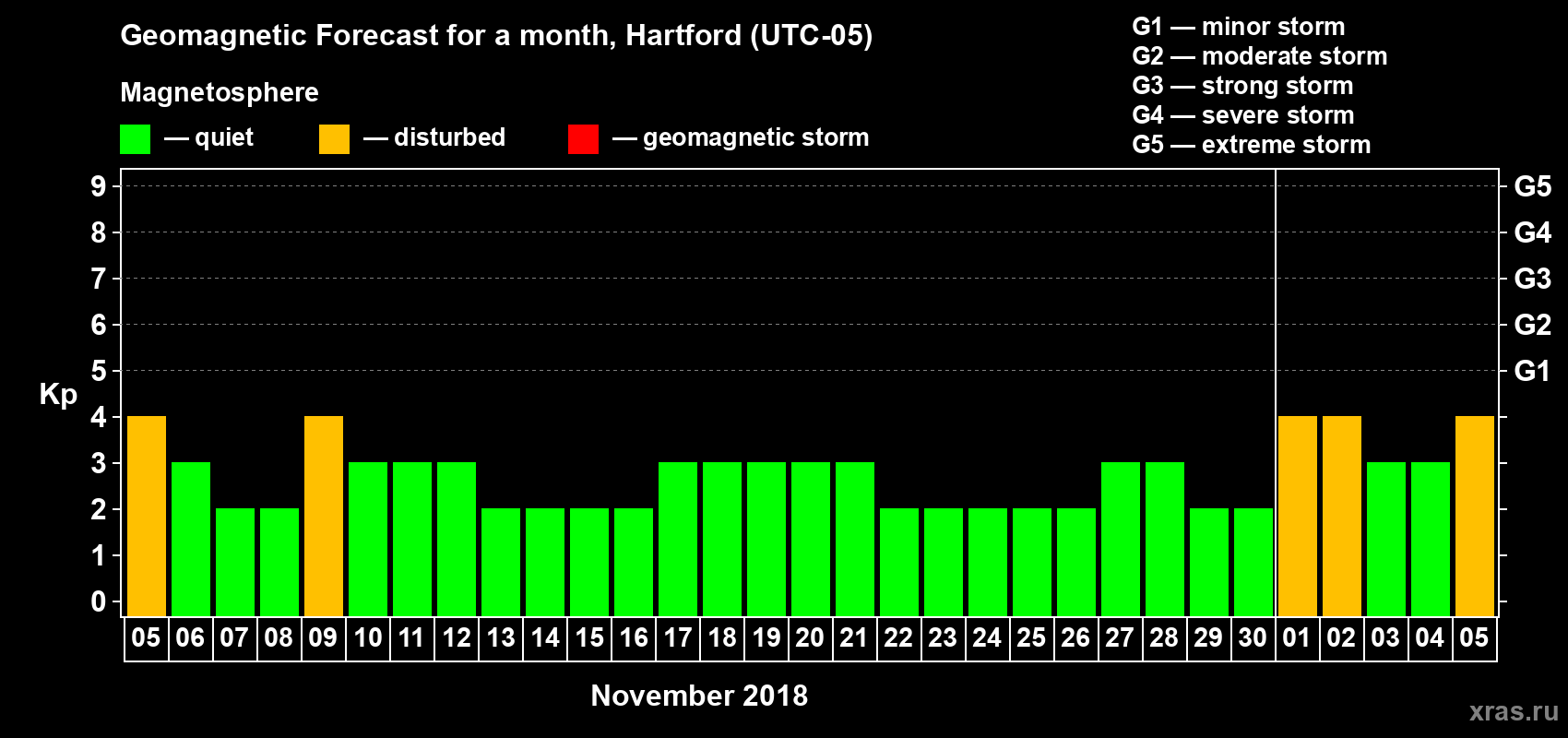 Geomagnetic storm forecast in Hartford for Nov 05, 2018