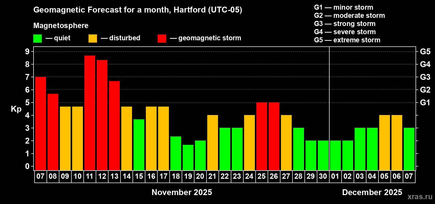 Geomagnetic storm forecast in Hartford for Nov 07, 2025