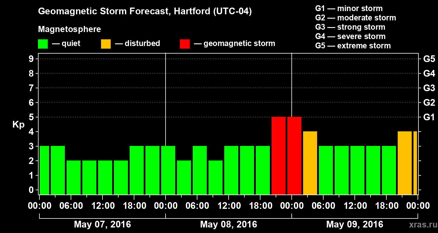 Geomagnetic storm forecast in Hartford for May 07, 2016