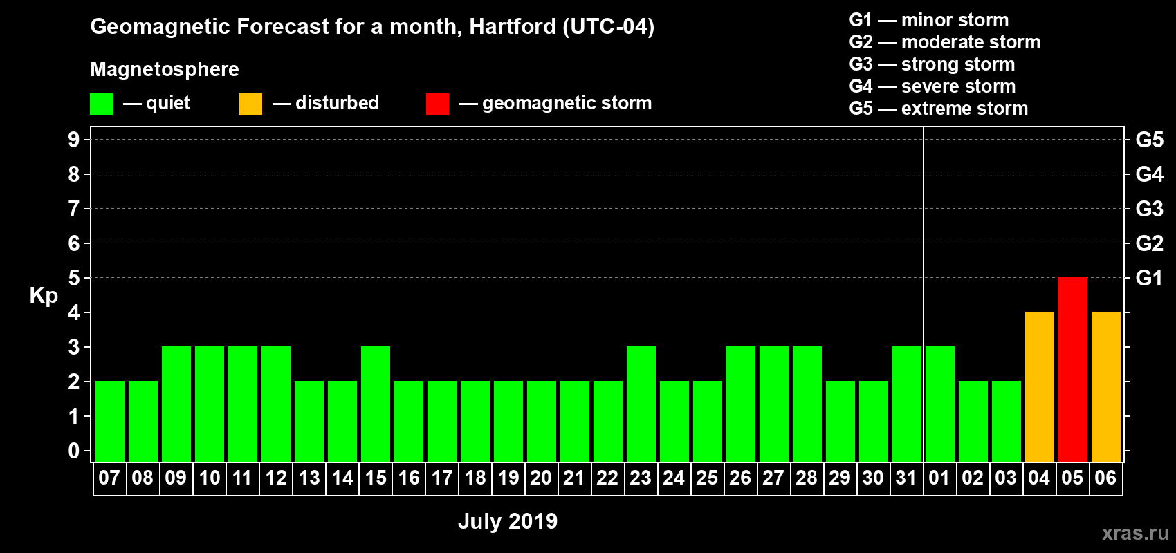 Geomagnetic storm forecast in Hartford for Jul 07, 2019