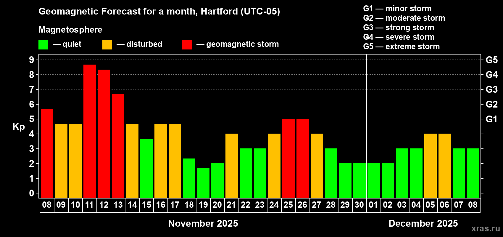 Geomagnetic storm forecast in Hartford for Nov 08, 2025