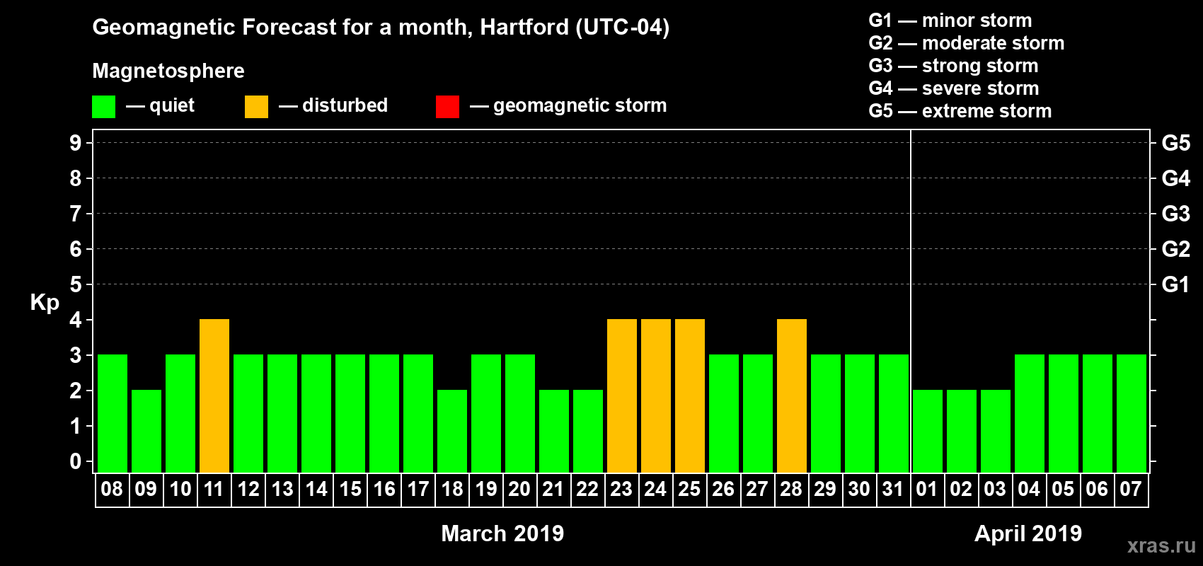 Geomagnetic storm forecast in Hartford for Mar 08, 2019