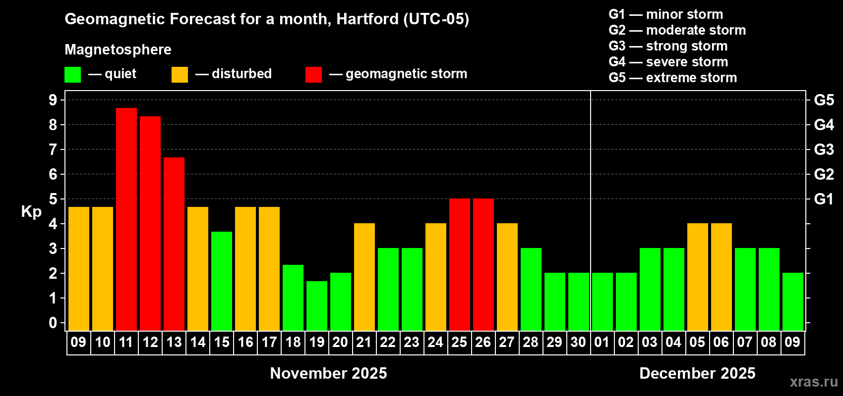 Geomagnetic storm forecast in Hartford for Nov 09, 2025