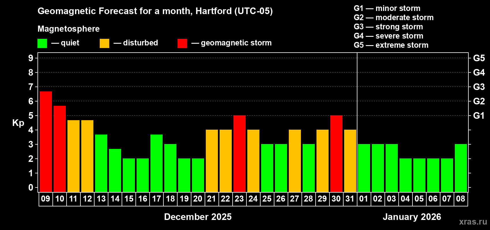 Geomagnetic storm forecast in Hartford for Dec 09, 2025