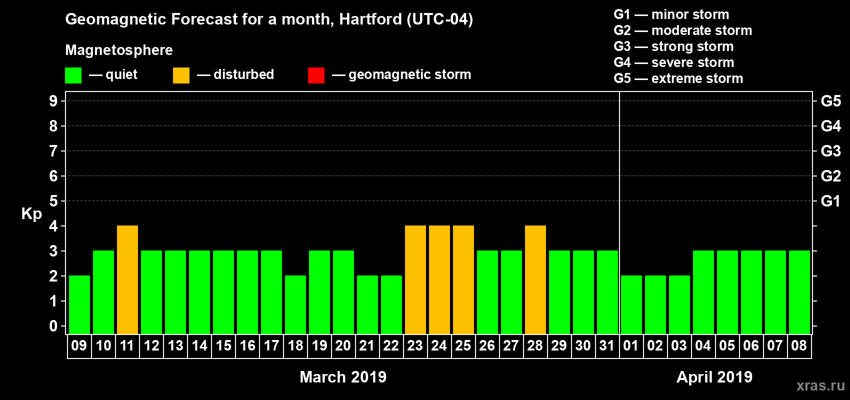 Geomagnetic storm forecast in Hartford for Mar 09, 2019