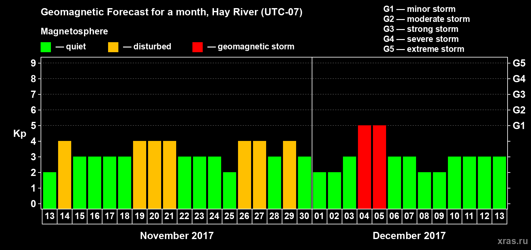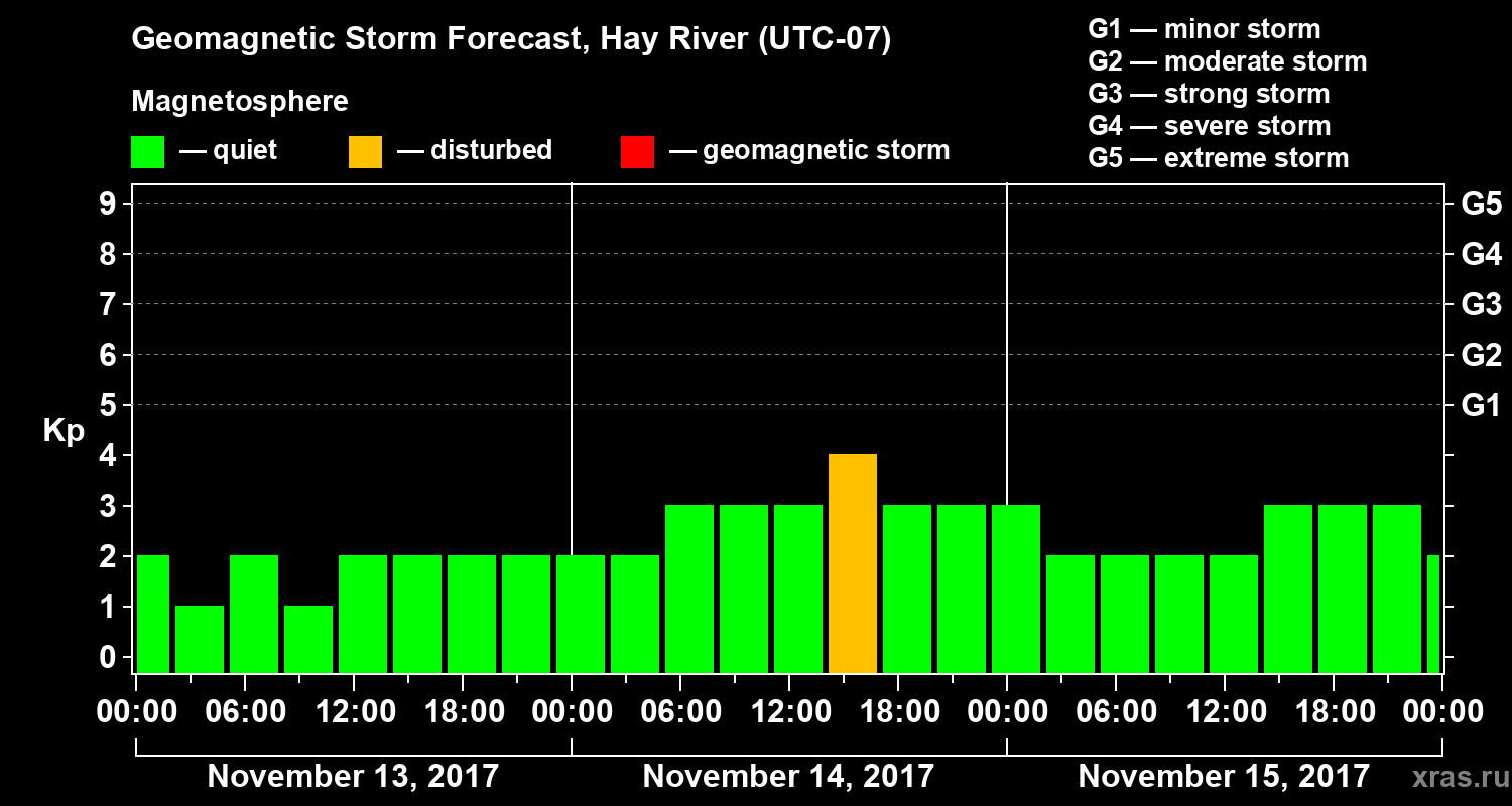 Geomagnetic storm forecast in Hay River for Nov 13, 2017