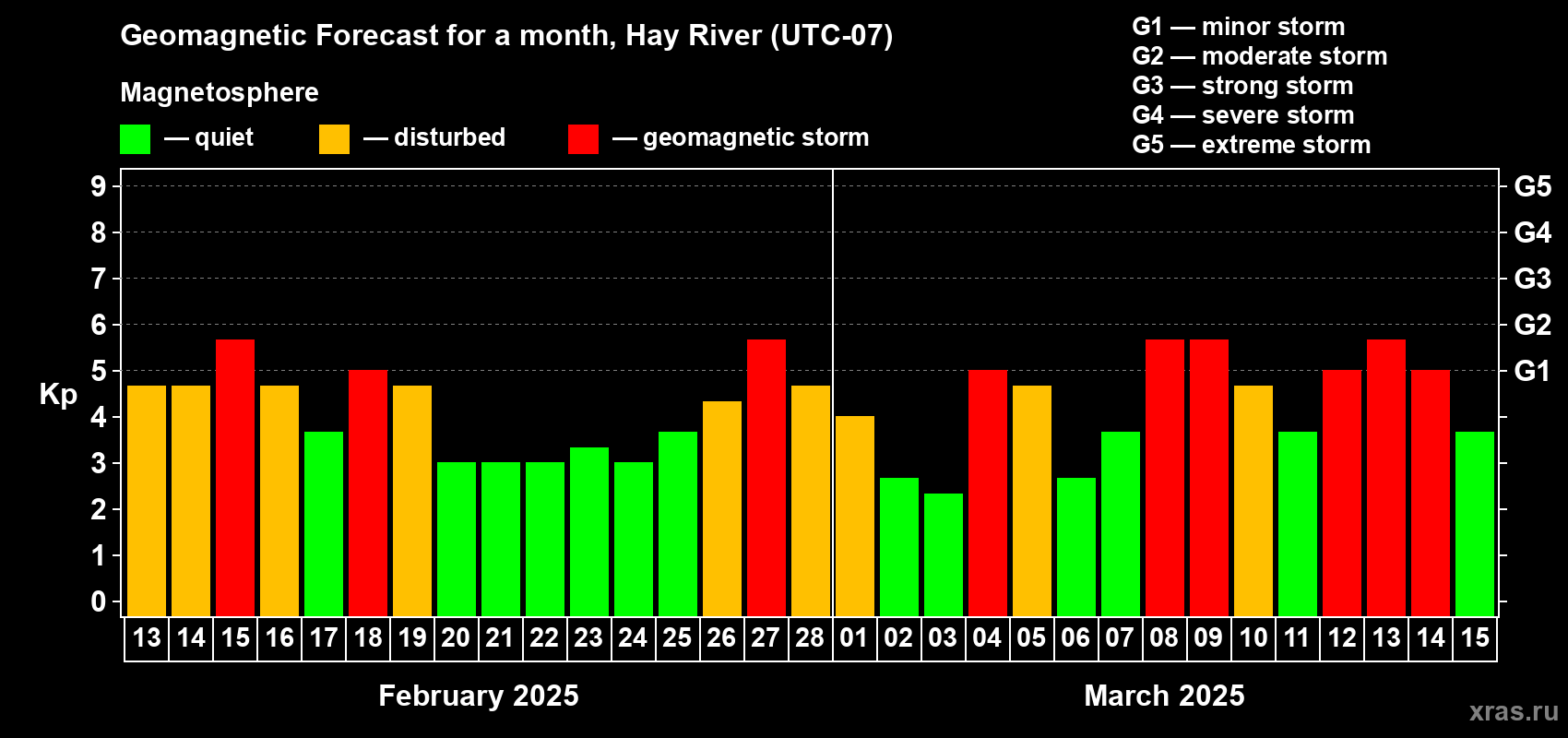 Geomagnetic storm forecast in Hay River for Feb 13, 2025