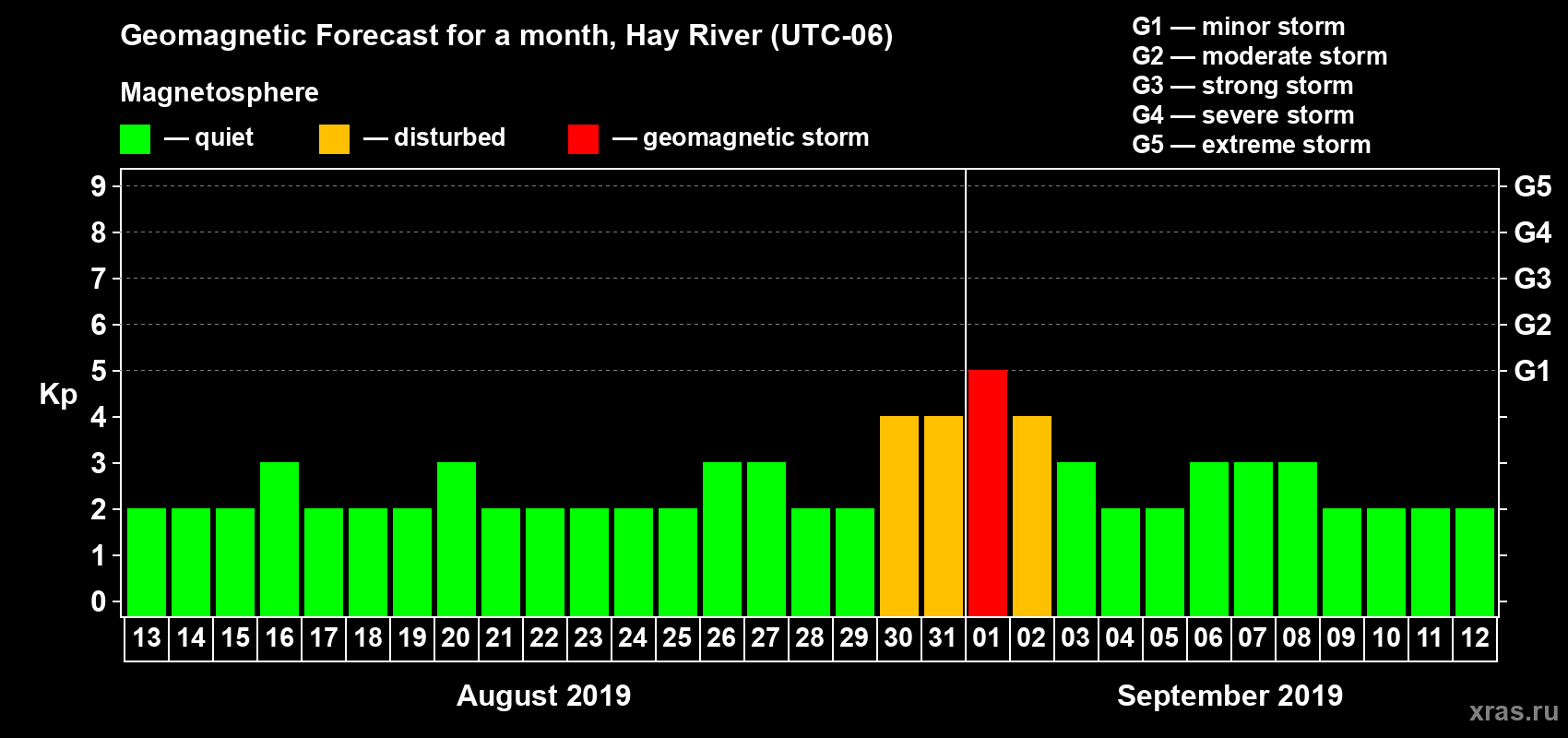 Geomagnetic storm forecast in Hay River for Aug 13, 2019