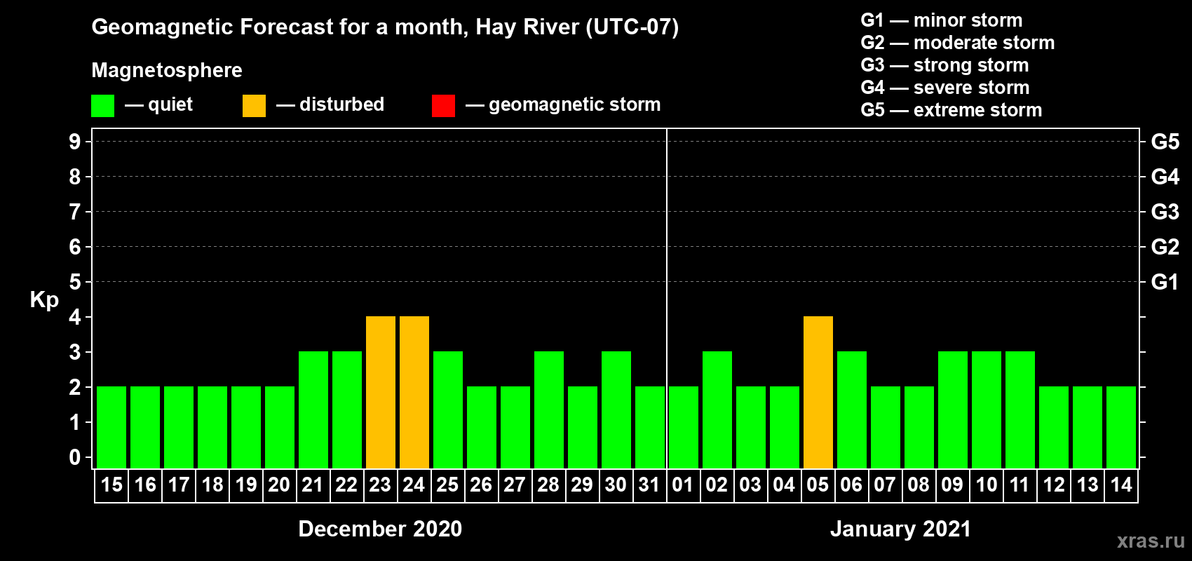 Geomagnetic storm forecast in Hay River for Dec 15, 2020