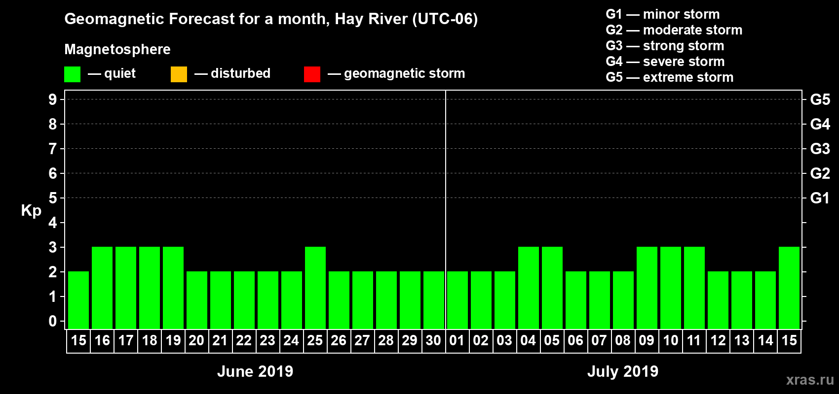 Geomagnetic storm forecast in Hay River for Jun 15, 2019