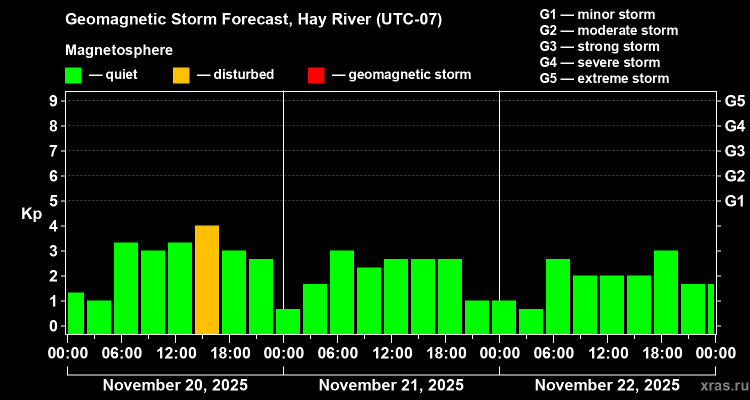 Geomagnetic storm forecast in Hay River for Nov 20, 2025
