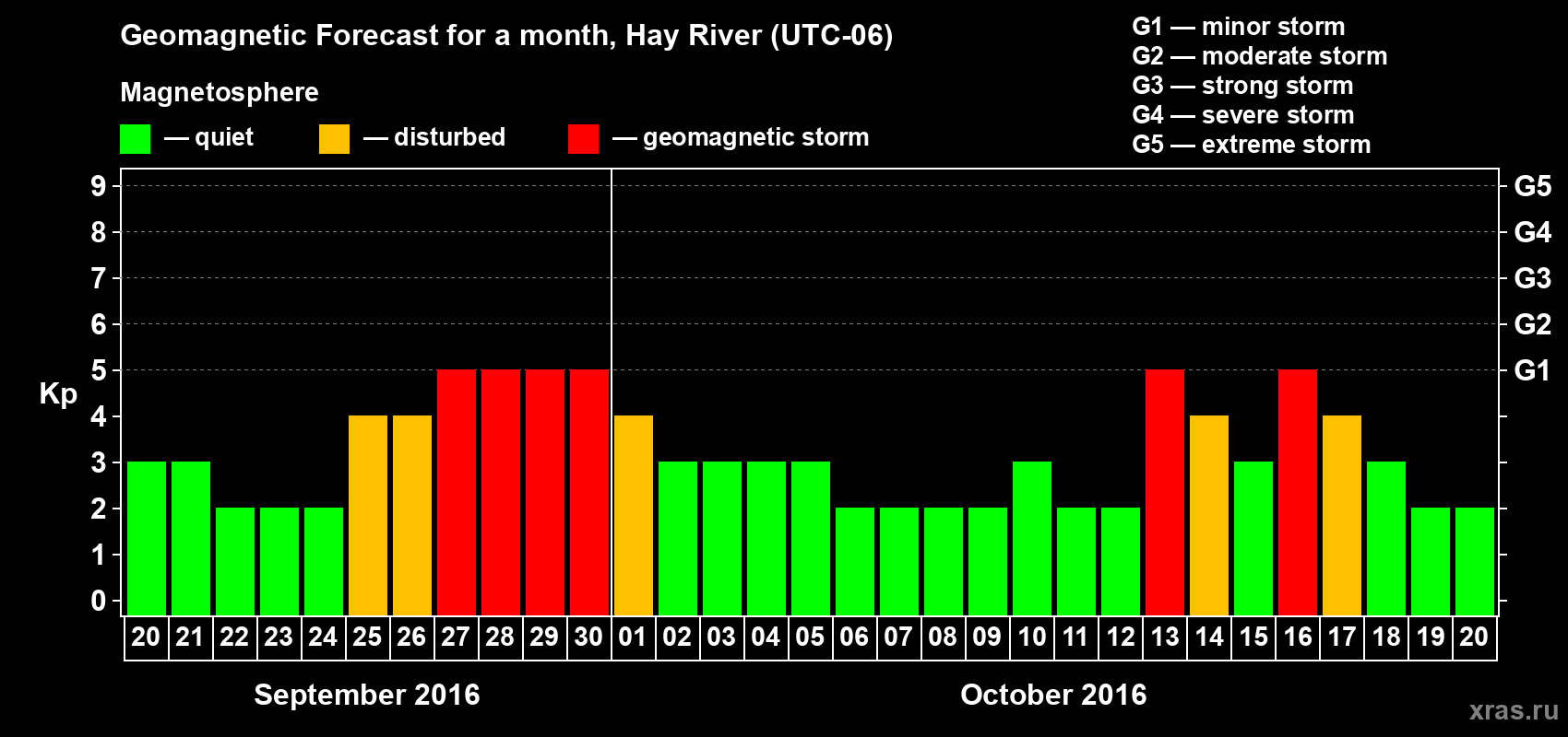 Geomagnetic storm forecast in Hay River for Sep 20, 2016