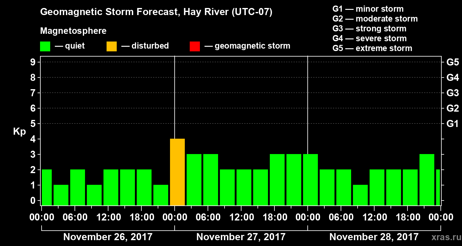 Geomagnetic storm forecast in Hay River for Nov 26, 2017