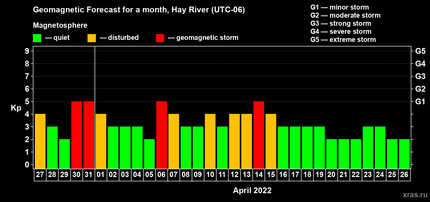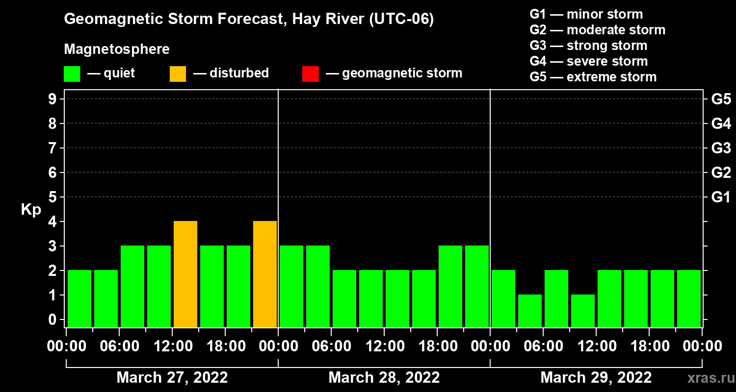 Geomagnetic storm forecast in Hay River for Mar 27, 2022