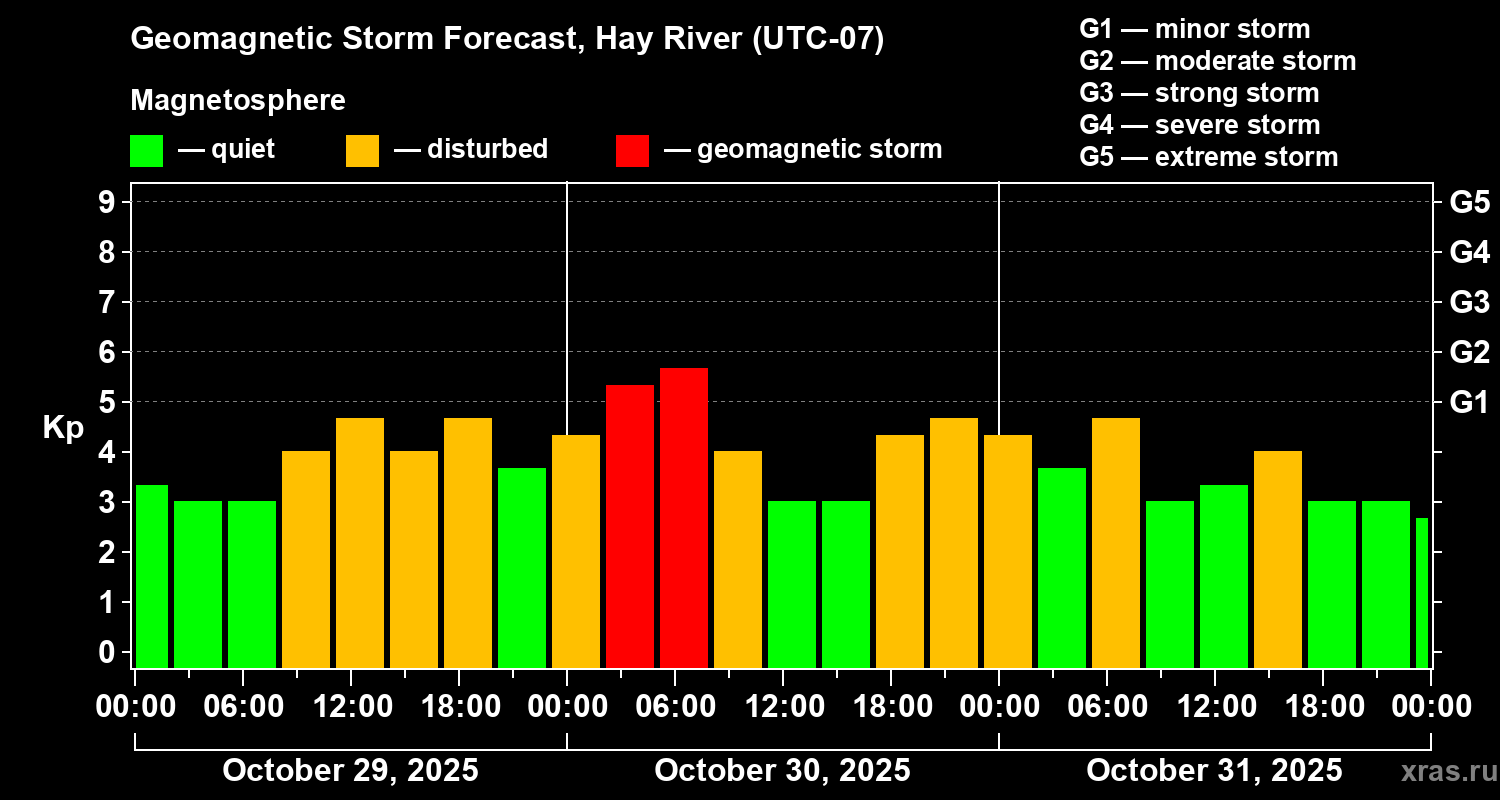 Geomagnetic storm forecast in Hay River for Oct 29, 2025