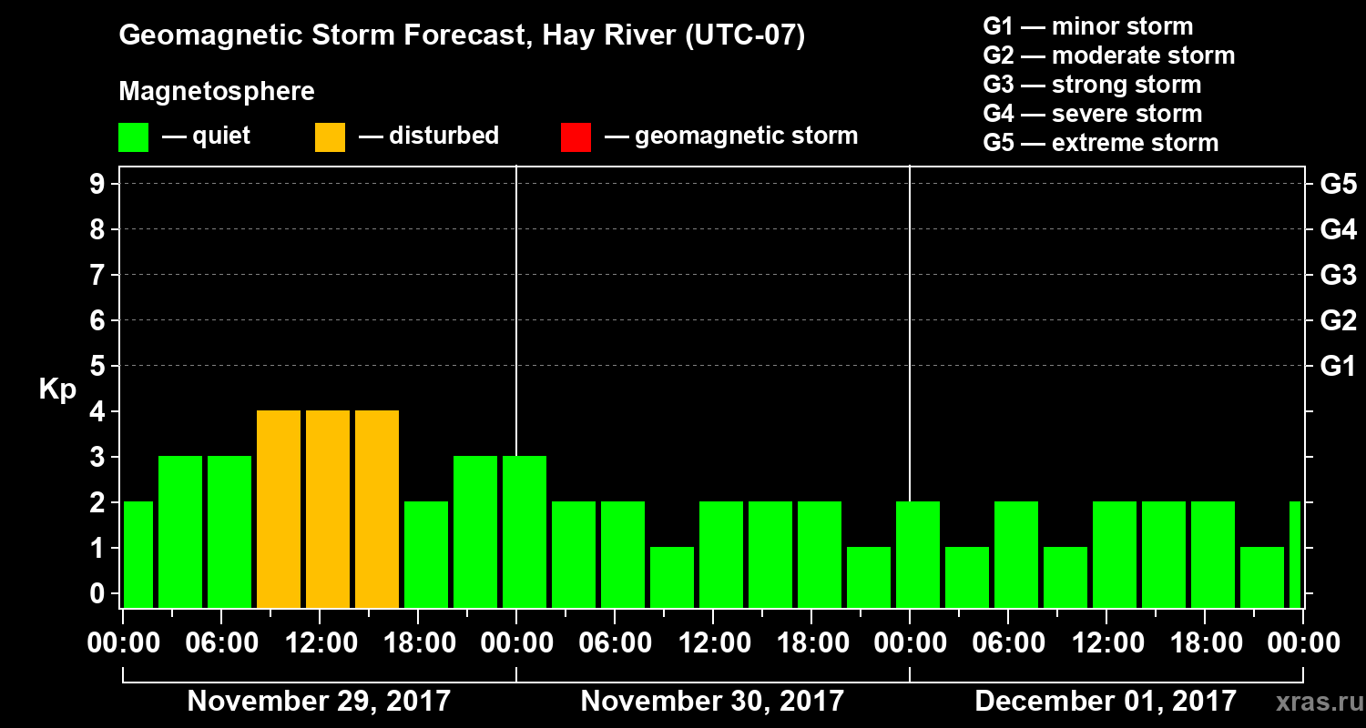 Geomagnetic storm forecast in Hay River for Nov 29, 2017