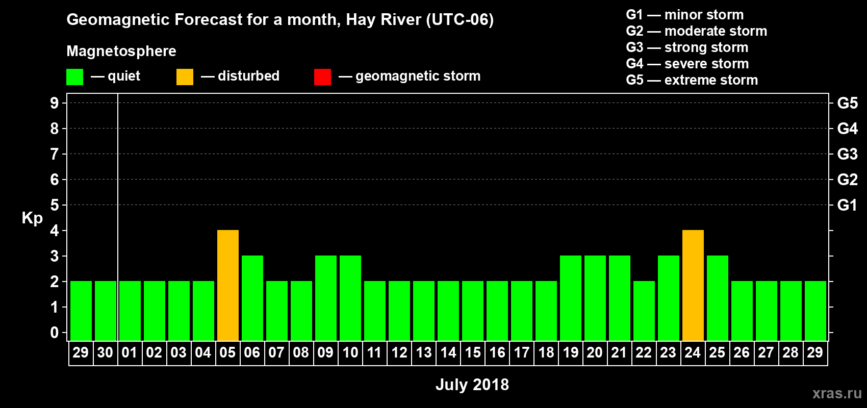 Geomagnetic storm forecast in Hay River for Jun 29, 2018