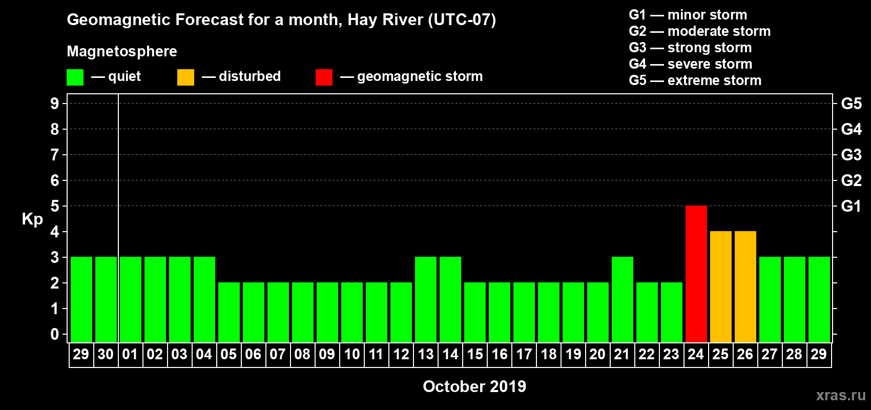 Geomagnetic storm forecast in Hay River for Sep 29, 2019