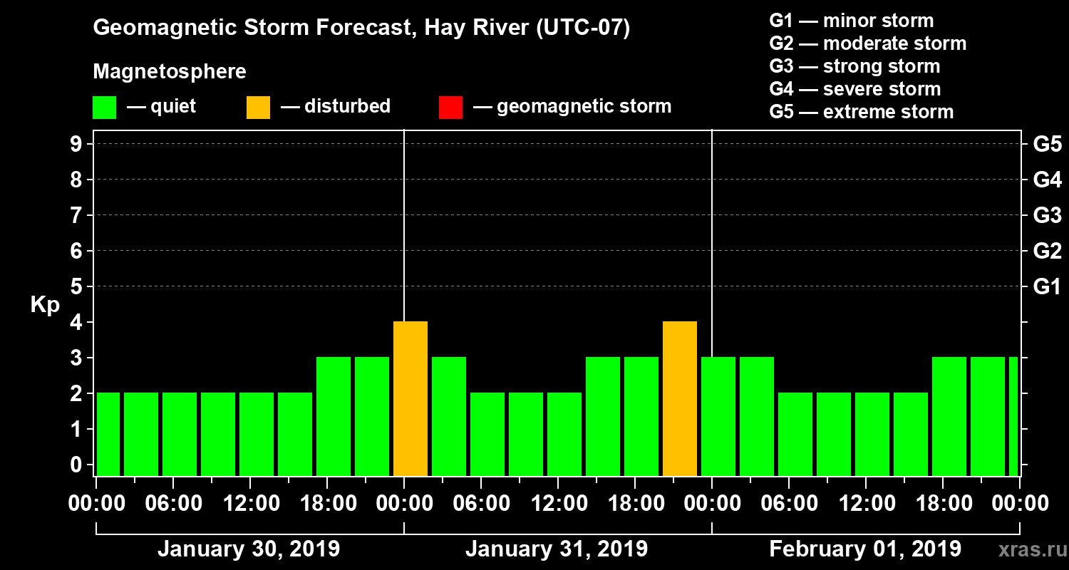 Geomagnetic storm forecast in Hay River for Jan 30, 2019