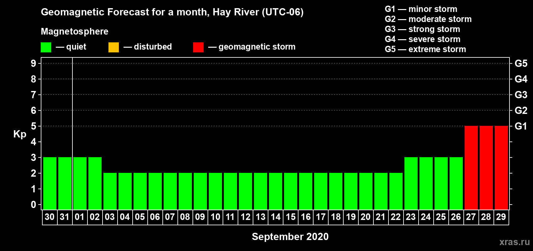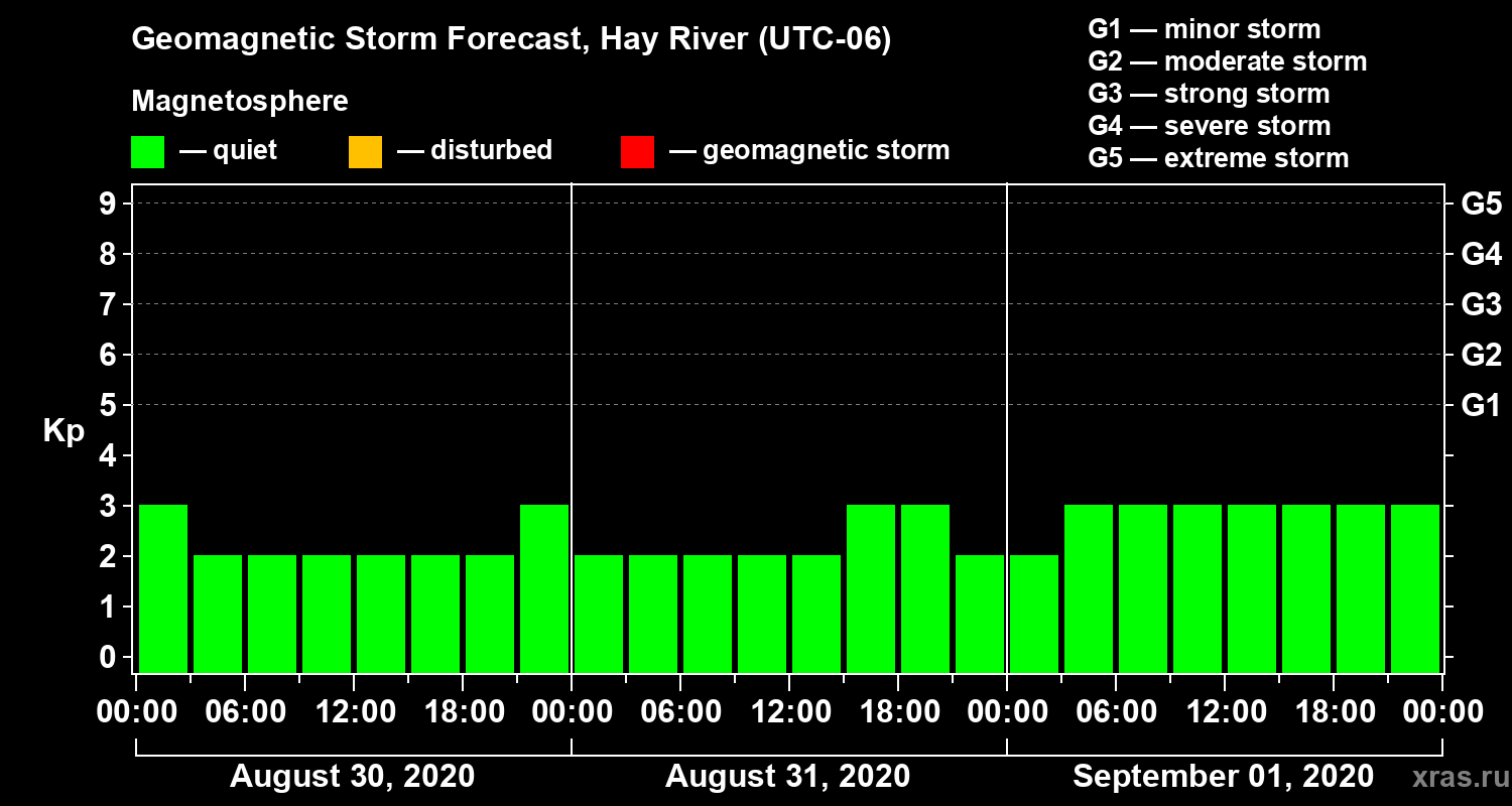 Geomagnetic storm forecast in Hay River for Aug 30, 2020