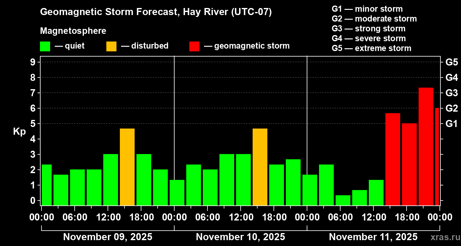 Geomagnetic storm forecast in Hay River for Nov 09, 2025