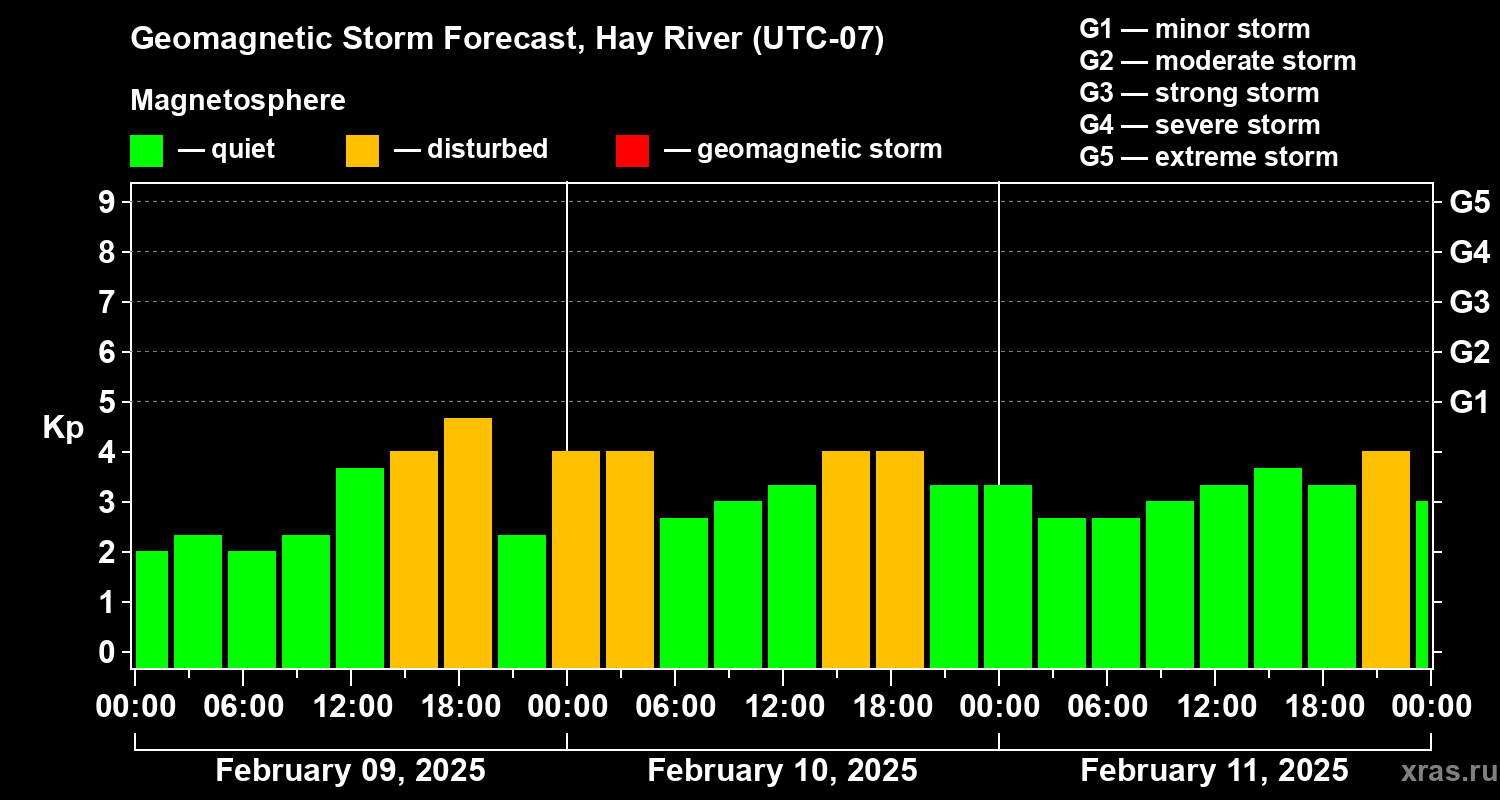 Geomagnetic storm forecast in Hay River for Feb 09, 2025