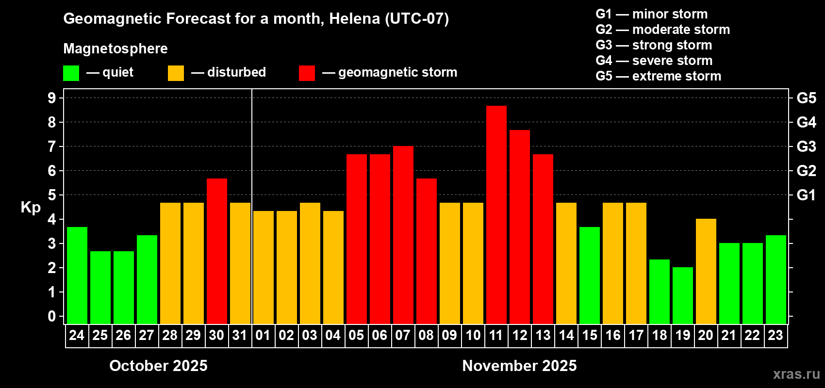 Geomagnetic storm forecast in Helena for Oct 24, 2025