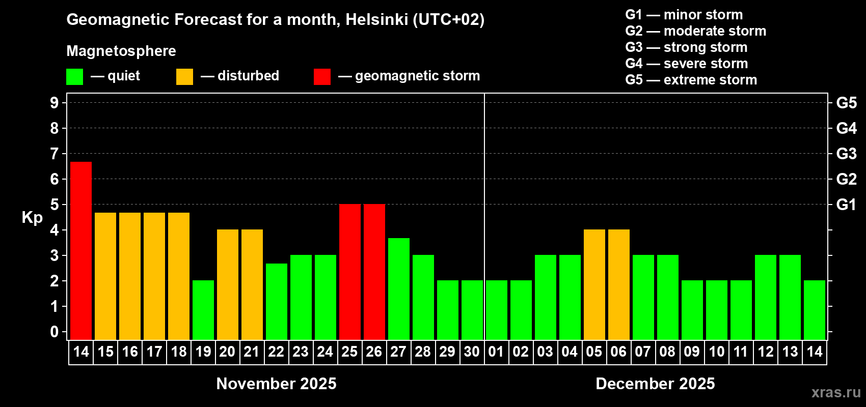 Geomagnetic storm forecast in Helsinki for Nov 14, 2025