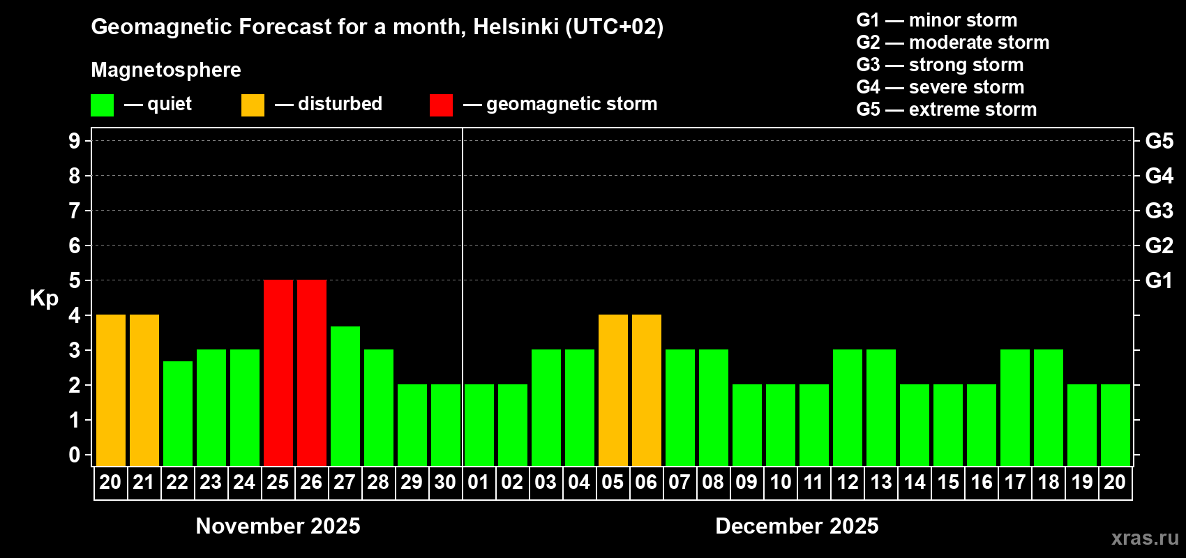 Geomagnetic storm forecast in Helsinki for Nov 20, 2025