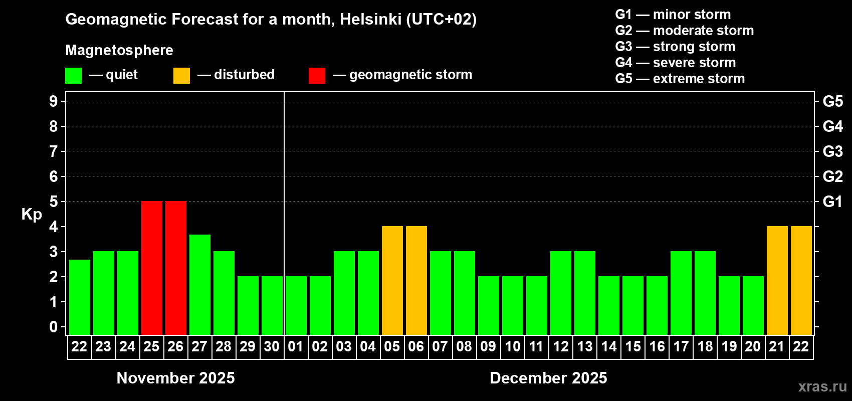 Geomagnetic storm forecast in Helsinki for Nov 22, 2025