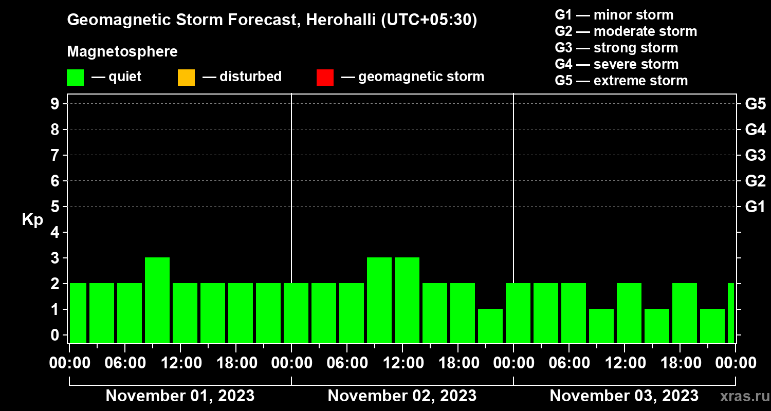 Geomagnetic storm forecast in Herohalli for Nov 01, 2023
